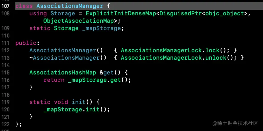 回到_object_set_associative_reference方法,我们可以发现AssociationsManager可以有多个。下面就到了AssociationsHashMap,这个是HashMap这是个哈希表,这个是唯一的。因为AssociationsManager方法里看到AssociationsHashMap是通过_mapStorage.get()方法获得,而_mapStorage是通过static声明的,是静态变量,也就是AssociationsHashMap是通过静态变量_mapStorage获取的,所以是全场唯一的。