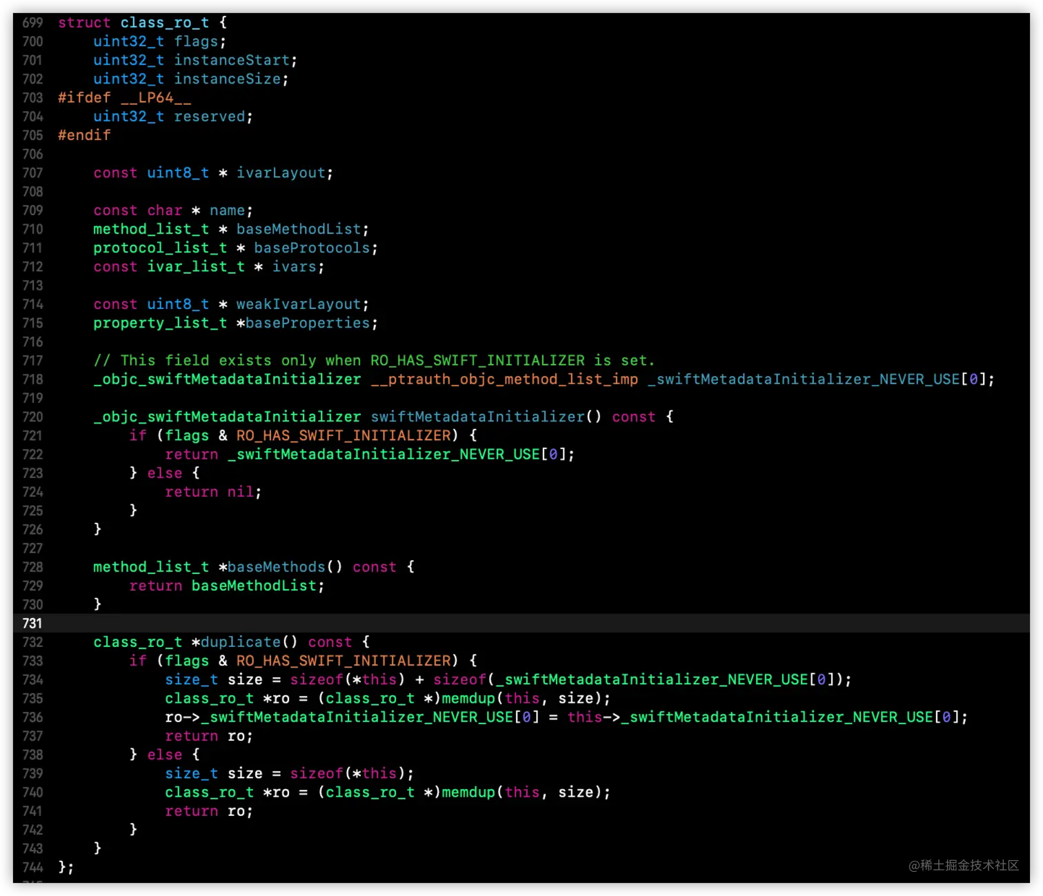 700-715行都是属性变量,在我们研究过程成基本上是不看的,我们知道class_ro_t存在Macho中,在编译期就处理完毕了,这意味着有个方法在编译期就能读到class_ro_t。那么这个时候就需要去看LLVM源码