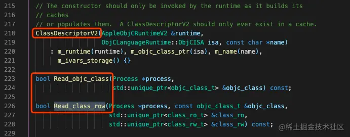 我们看到上面的两个方法红框名字相同,上面是调用地方,最后一个方法就是如果初始化ClassDescriptorV2,就会调用Read_class_row也就是完成class_ro_t。