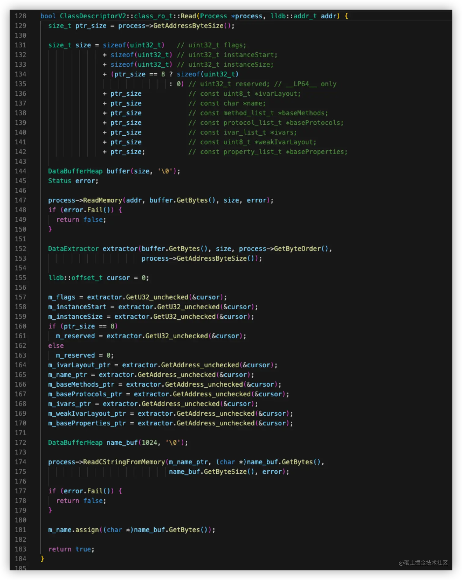 这就是LLVM源码中的class_ro_t结构,我们发现read方法,下面看下read方法实现。