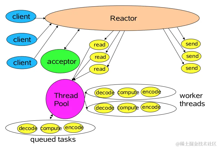 仔细分析一下我们需要的线程,其实主要包括以下几种: 1. 事件分发器,单线程选择就绪的事件。 2. I/O处理器,包括connect、read、write等,这种纯CPU操作,一般开启CPU核心个线程就可以。 3. 业务线程,在处理完I/O后,业务一般还会有自己的业务逻辑,有的还会有其他的阻塞I/O,如DB操作,RPC等。只要有阻塞,就需要单独的线程。