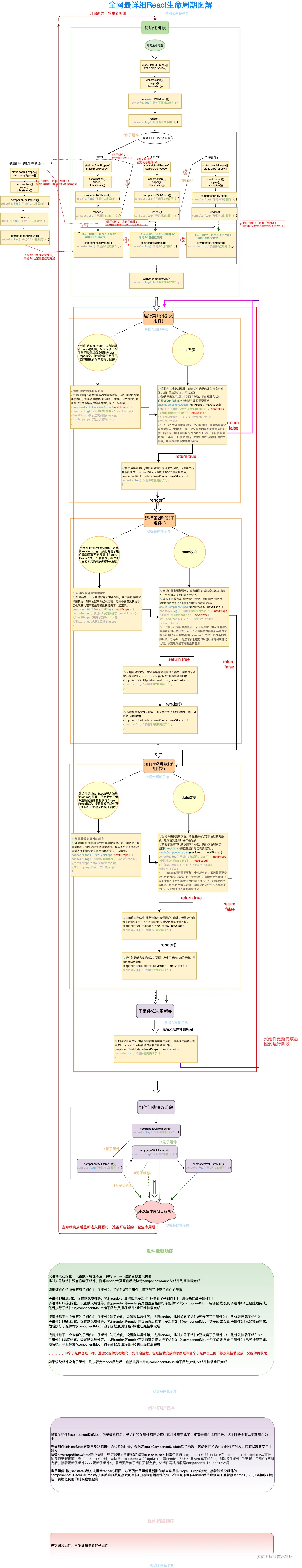 鉴于网上很多有关React生命周期的图解似乎都都不详细,于是近期整理了一下React的生命周期,跟大家分享一下,建议关注收藏,可以时不时回顾一下,如有不对的地方望大家指出,一起学习!