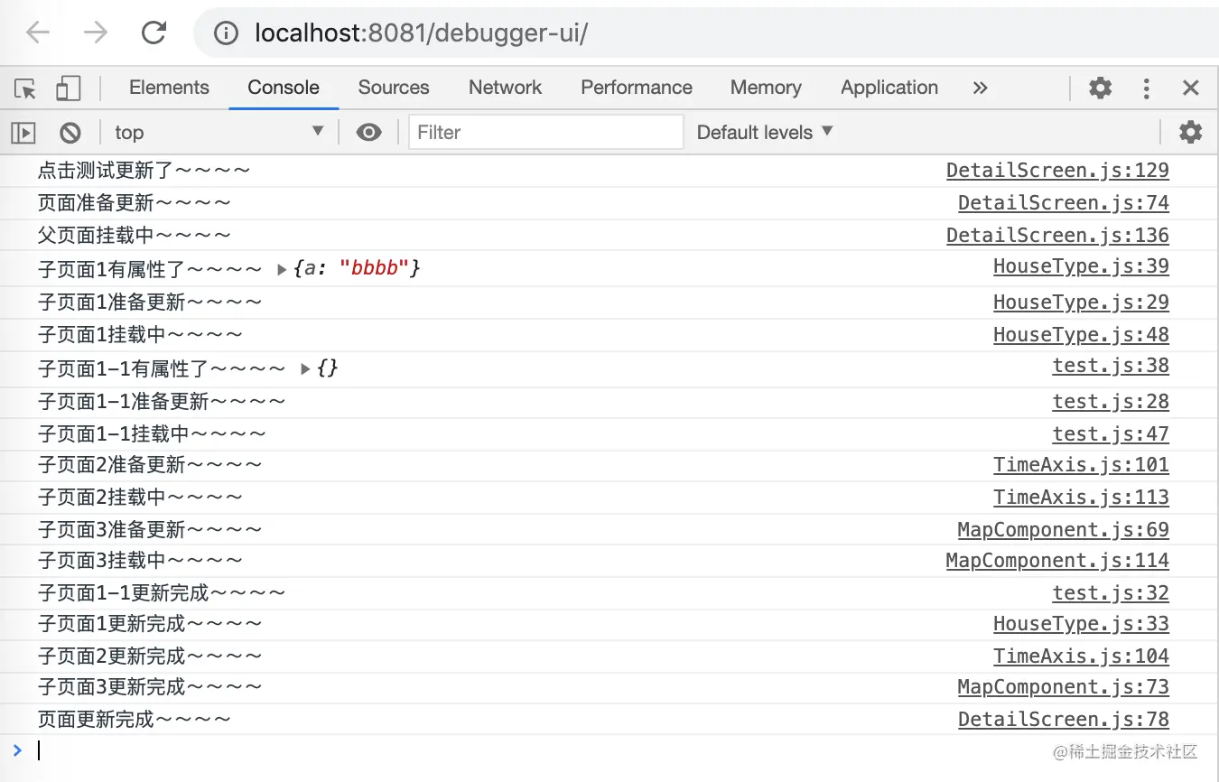 可以看出父组件先发起更新,执行render时,优先依次更新完成子组件后,父组件最后才更新完成,可以理解成两个阶段,一个是发起挂载动作(由父到子,同级组件得先等上一个同级等的子组件都发起更新动作了才能轮到),另一个是结束更新动作(由子到父,同级组件得等上一个组件更新完成了才能轮到,依次进行)