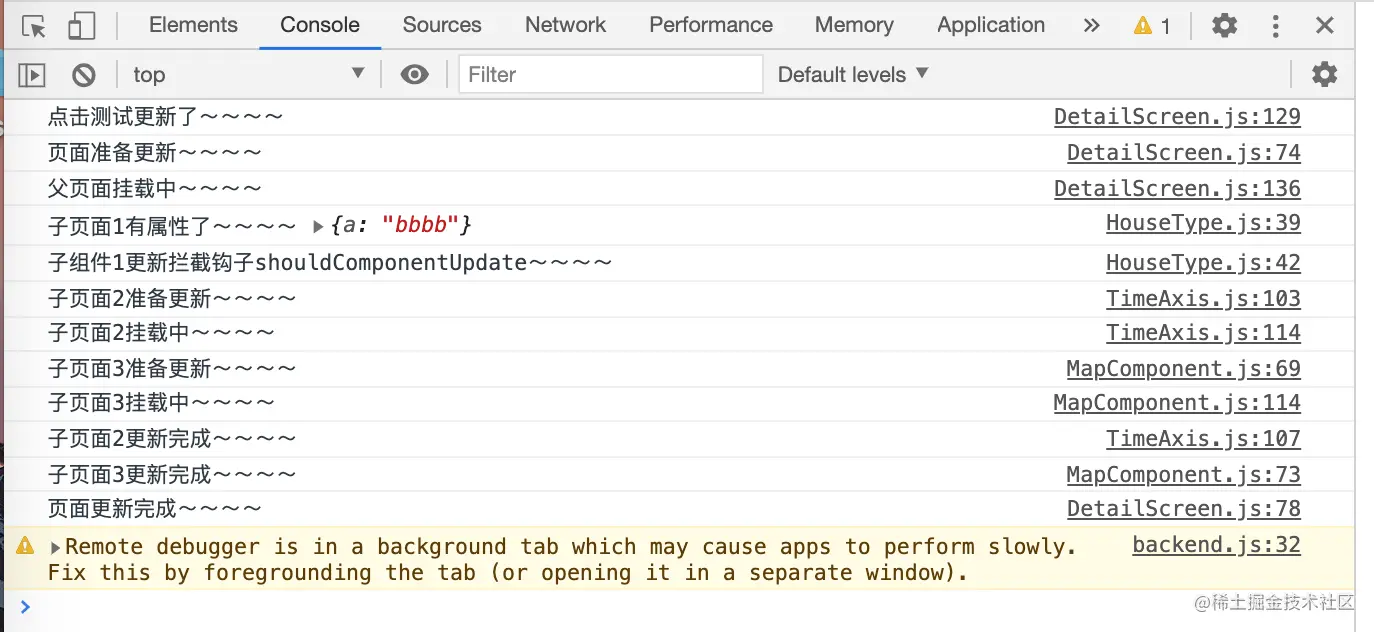 当子组件1HouseType将shouldComponentUpdate中的返回值变为以下后,再点击后,子组件1将通过return false来定向阻止更新,自然后面的componentWillUnmount和componentWillReceiveProps也不会再继续执行了