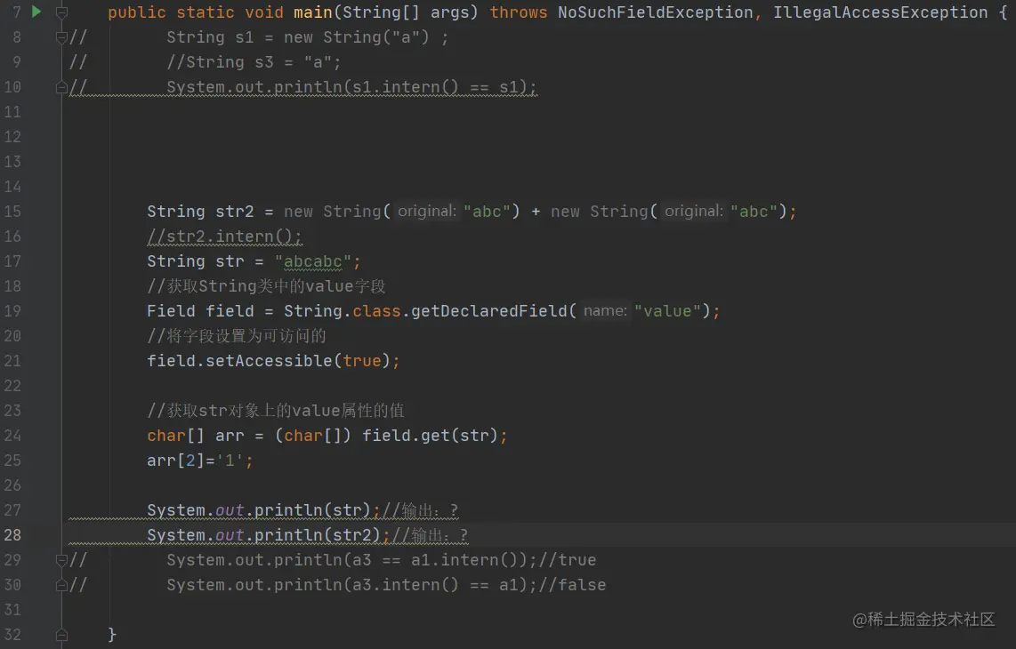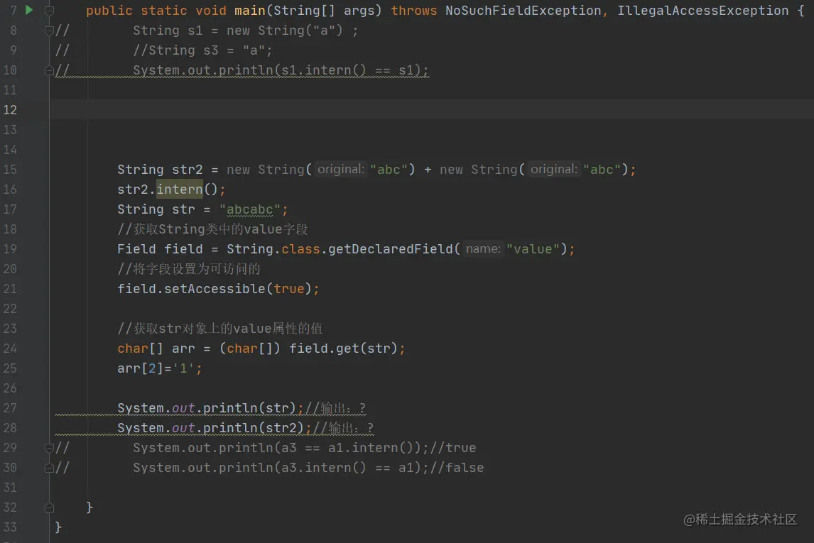 16行是关键,他会导致输出结果不同,如果没有这行代码,则str指向的是堆内存的abcabc,str2指向的是字符串常量池中的abcabc, 如果有了这行代码,str跟str2都是指向str2的引用(因为常量池中存的就是这个引用),也就是同一个东西,改变其中一个也就两个都变了