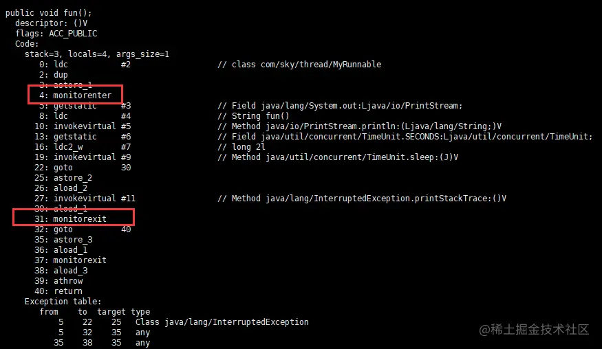 然后是对修饰代码块的代码反编译,这次我们发现没有了ACC_SYNCHRONIZED标识符,取而代之的是monitorenter和monitorexit两条指令,monitorenter和monitorexit分别表示同步代码块开始和结束的位置。细心的朋友应该会看到其实下面的图中有两个monitorexit,主要的原因是如果程序发生异常退出而没有释放锁,则可能发生死锁,这里加上退出指令可以保证异常情况下也可以释放锁。