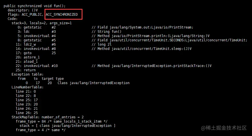 首先是对修饰方法的代码进行反编译,可以看到方法使用ACC_SYNCHRONIZED标识符修饰,JVM将被该标识符修饰的方法视为同步方法。