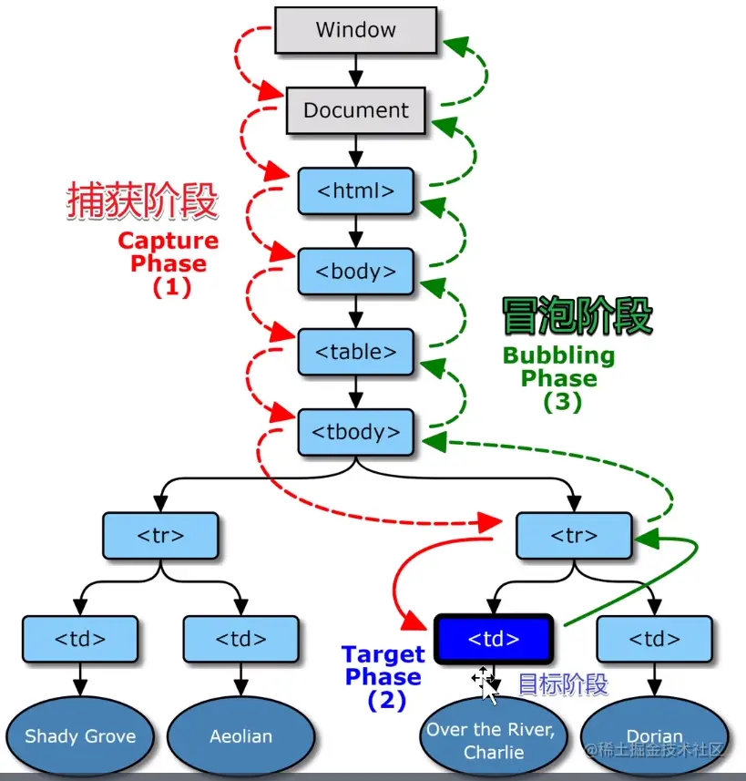 当标签被点击时,那要先调用谁的函数呢?捕获阶段会从window开始,结束后。会到达目标阶段判断是否冒泡(一般会需要冒泡),然后再从到window。