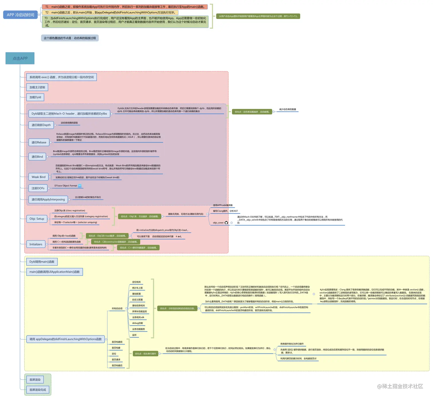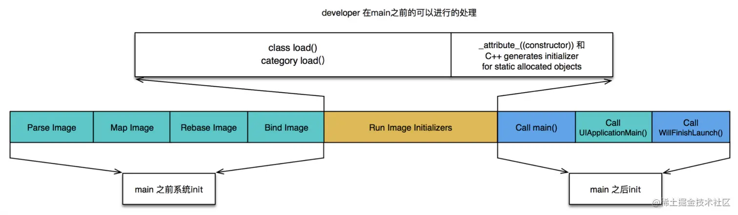 dyld主导,将可执行文件加载到内存,顺便加载所有依赖的动态库, 并由runtime负责加载成objc定义的结构。 - 所有初始化工作结束后,dyld就会调用