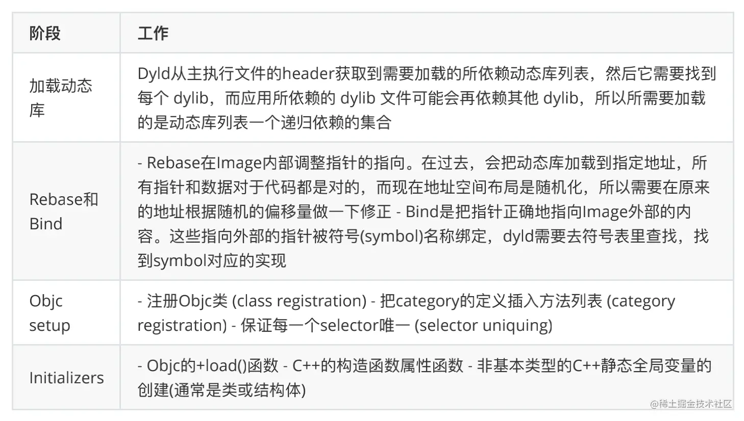 开始将程序二进制文件初始化) 当我们点击 App 图标,内核就开始做启动程序的初始化,然后交给 dyld(The Dynamic Link Editor,动态链接器); dyld 首先会读取镜像文件,然后递归的查找动态库,利用ImageLoader来将其加载到内存中。 -
