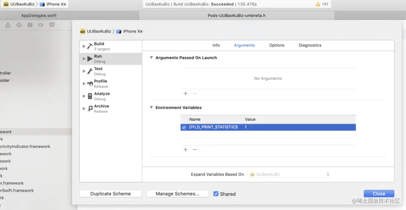 - 通过添加环境变量可以打印出APP的启动时间分析(Edit scheme -> Run -> Arguments)