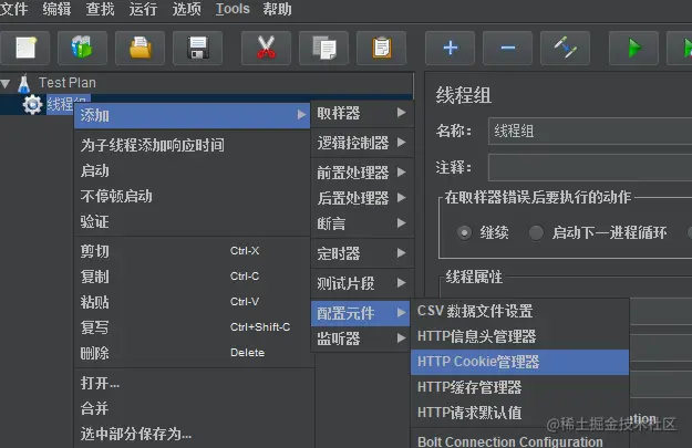 右键线程组->添加->配置元件->HTTP Cookie管理器