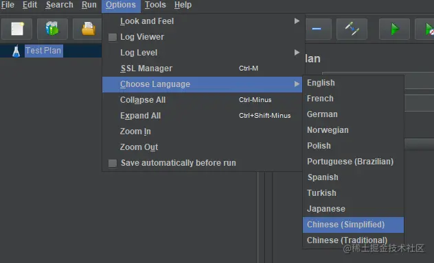 Jmeter菜单栏选择Optionsà-->Choose Languageà --> Chinese (Simplified)
