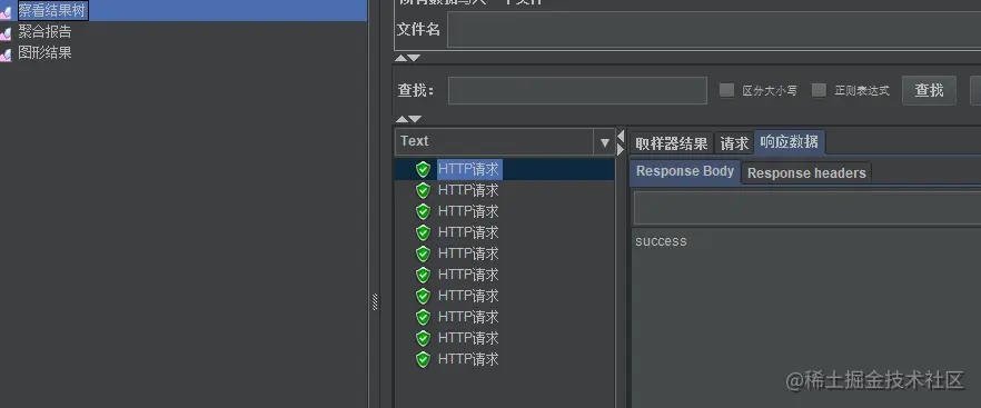 1、查看结果树:打开察看结果树,绿色代表测试通过,红色代表测试失败。在此我们可以看到详细的请求头、响应时间、请求参数和返回结果;方便我们进行接口调试