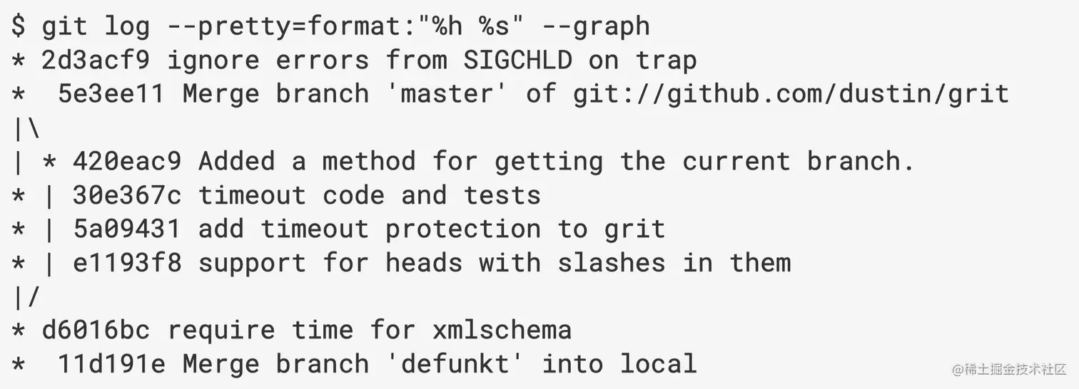 git log还有一种参数的用法是--graph,可以展示出提交的一个树形分支结构。也是非常非常好用的,但是我找不到合适的repo展示,所以用一个官方的例子展示给大家: