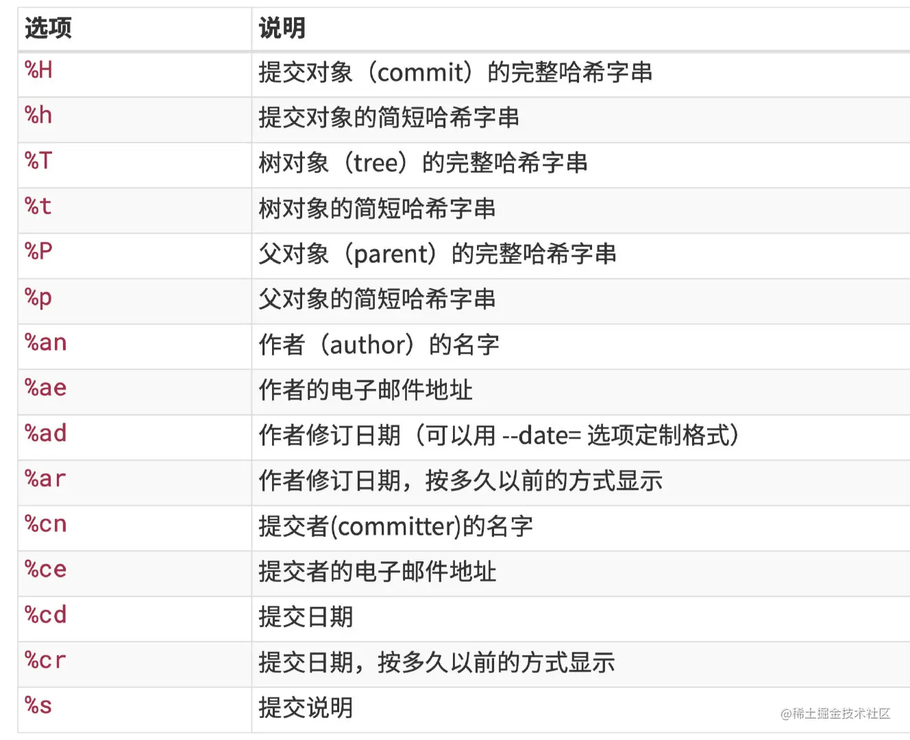 这正是我们想要的,这里的%h, %ad其实也是官方提供的参数,他们分别表示一种信息。比如%h表示短commitid,%ad表示提交时间,%an表示作者信息,%s表示提交时的comment。当然可选的参数不止这些,官方提供了一个表格,表格当中的参数都可以选择。