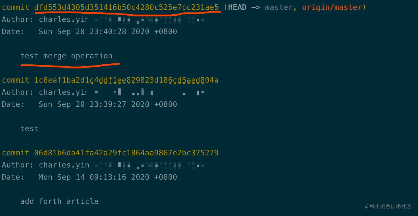log当中有两处比较重要的信息,我都用红笔高亮了出来。其中一个是commit后面跟着的一长串,这个是commit id,它在git仓库当中是唯一的,我们可以用它来锁定一个commit。比如刚才上面提到的git diff和某一个commit比较,传入的commitid就是这个。