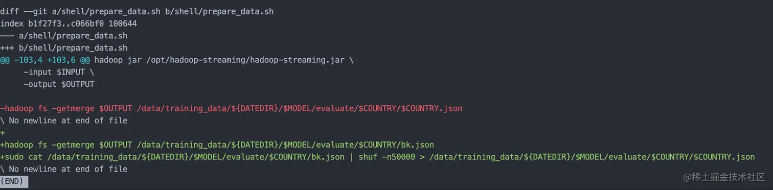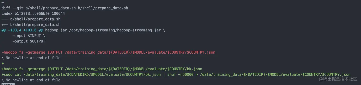 当然git diff如果不加任何参数的话,会默认展示所有的文件改动,有时候我们改动的量比较大,看起来也会比较累。这个时候我们可以加上文件名,查看一下某一个文件具体的改动。比如上面例子当中的改动,发生在一个shell文件当中,我可以直接运行git diff shell/prepare_data.sh,也就是这个shell文件对应的路径,会发现其他的改动都看不到了。