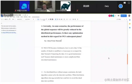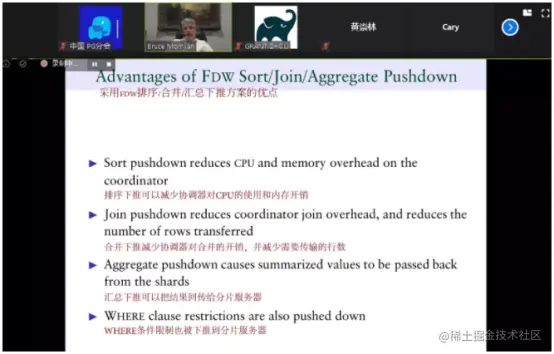 北京时间5月16日上午,美东时间5月15日晚,PostgreSQL国际社区联合创始人、EDB副总裁Bruce Momjian做客中国PostgreSQL分会《PostgreSQL大咖面对面》活动现场,在Cary Huang和David Zhang两位志愿者的同声传译帮助下,与近百位PostgreSQL从业者、爱好者一起探讨未来的PostgreSQL分片。