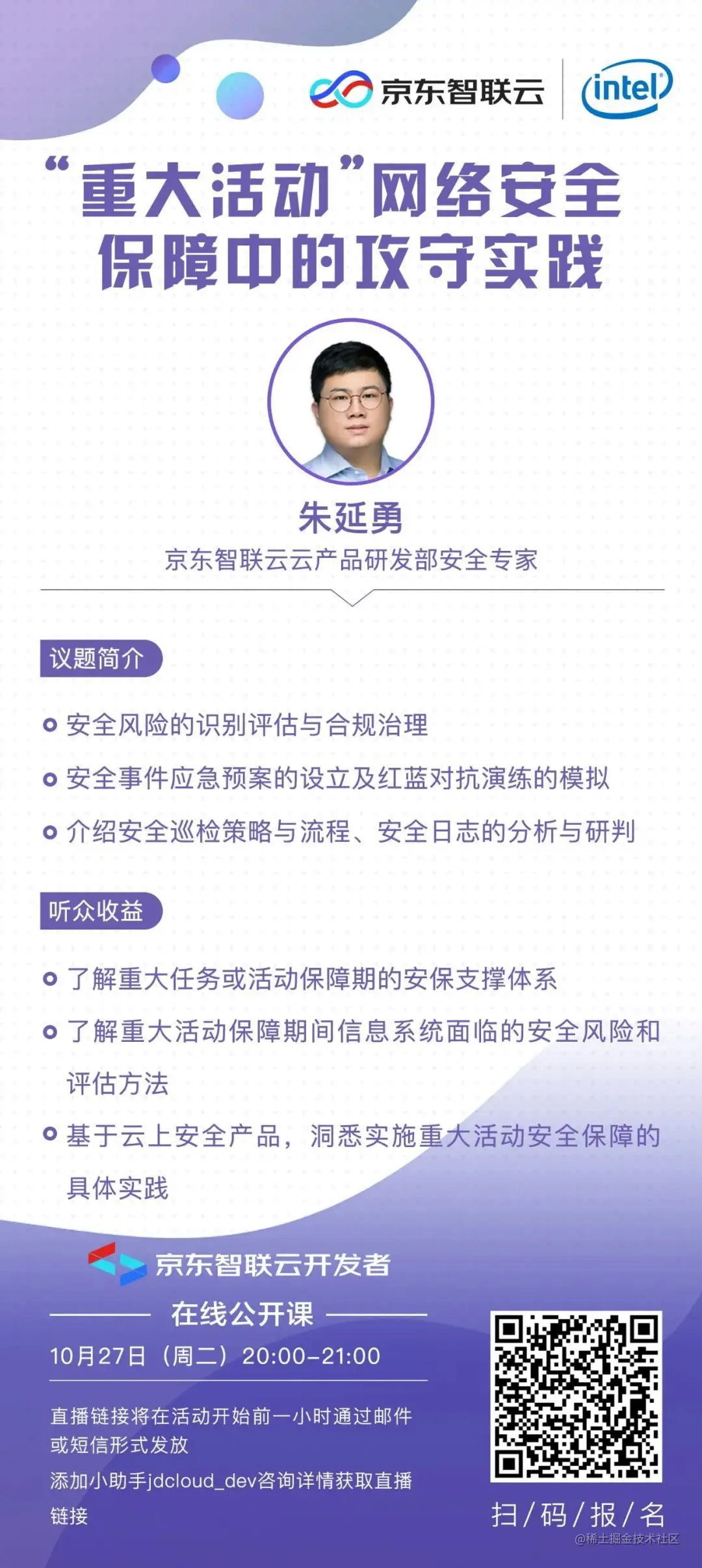 10 月 27日晚 20:00,_京东智联云云产品研发部安全专家 朱延勇老师,将会为大家带来主题为《 _“重大活动”网络安全保障中的攻守实践》_的直播分享,为大家介绍安全风险的识别评估与合规治理,并为大家演示 _安全事件应急预案的设立及红蓝对抗演练的模拟,以及安全巡检策略与流程、安全日志的分析与研判。_感兴趣的小伙伴赶紧点击 _【阅读原文】_或者扫描下方二维码报名吧!