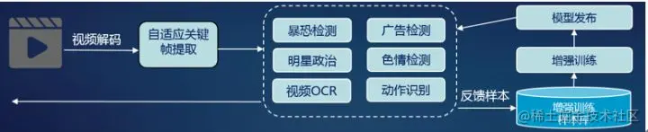 - 内容审核,用户采集内容上传存储前,华为云EI提供视频内容智能审核能力,包括视频质量评估、黄/暴/恐鉴别、重复/相似鉴别及版权指纹分析等,解决重复/疑似不安全内容进入传播流程。
