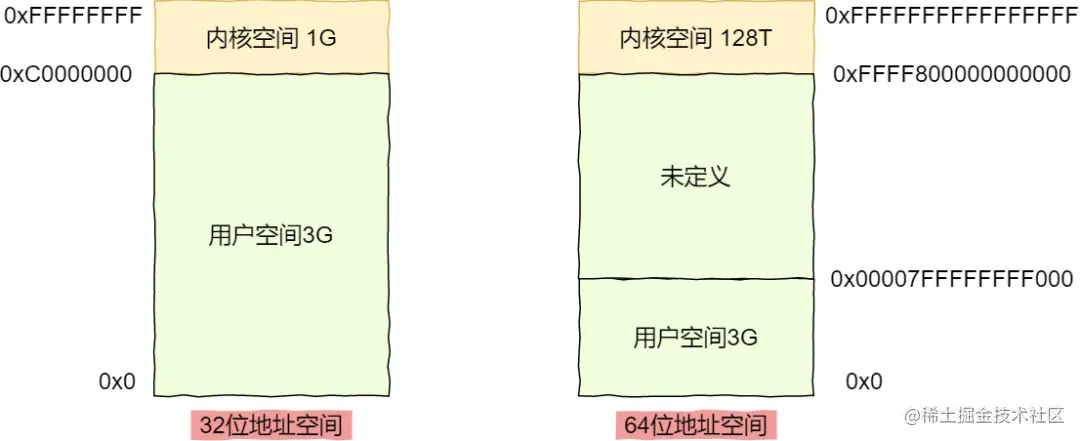 从这个图很明显的看出32位系统中内核空间1G,而64位的内核空间与用户空间都是128T。
