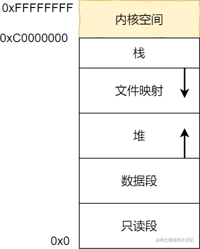 虚拟地址又分为内核空间和用户空间,不同字长的处理器地址范围也不同。我们下面分别看看32位和64位的虚拟地址空间