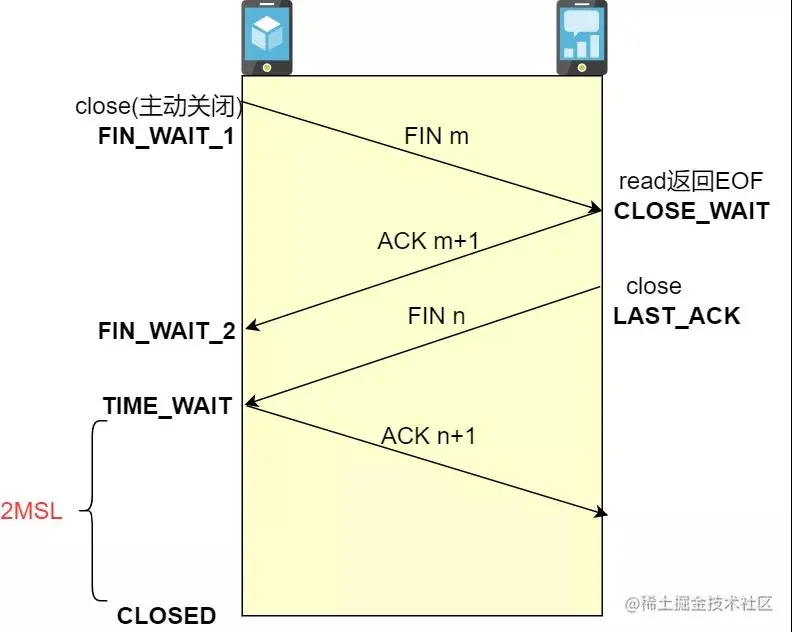 如下图所示的TCP四次挥手,TCP连接准备终止的时候会发送FIN报文,主机2进入CLOSE_WAIT状态并发送ACK应答。主机1会在TIMEWAIT停留2MSL的时间。
