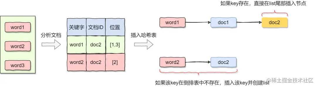 - 将关键字key插入哈希表。如果哈希表已存在这个key,就在对应的posting list中追加节点,记录文档ID。如果哈希表没有响应的key则插入该key并创建posting list和对应的节点