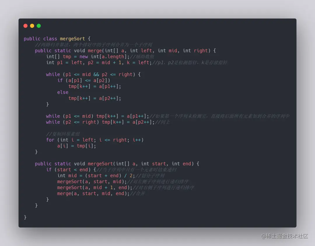 这是我之前说过的常考算法之一,中心思想即分治,可通过递归一直拆分,递归的结束条件即不可再分,即分为1个的时候就停止。从第一个开始时将每一个模块当作一个已经排序好的数组,有如双指针,在两个数组头设立指针,进行值的比较,然后插入到新数组中,上代码咯