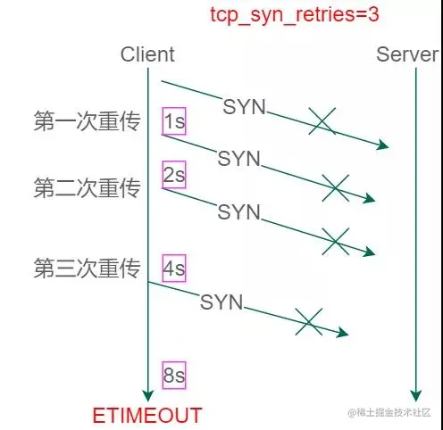 当 Client 发送 SYN 后,如果过了1s还没有收到 Server 的回应,那么进行第一次的重传。如果经过了2s没有收到Sever的响应进行第二次的重传,一直重传tcp_syn_retries次。这里的重传三次,意味着当第一次发送SYN后,需要等待(1 +2 +4 +8)秒,如果还是没有响应,connect就会通过ETIMEOUT的错误返回。