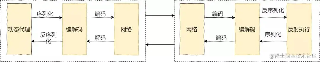 服务提供方通过反序列化的对象找到对应的实现类完成整正的调用,这样就是一次rcp的调用。画个图加深下印象