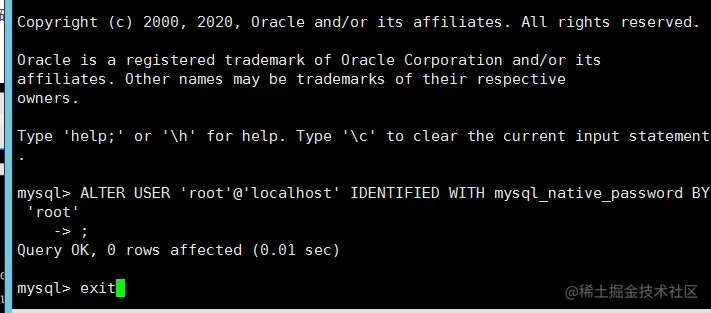 11、通过 ALTER USER 'root'@'localhost' IDENTIFIED WITH mysql_native_password BY 'root'; 命令来修改密码。修改完成后,exit 退出重新登陆