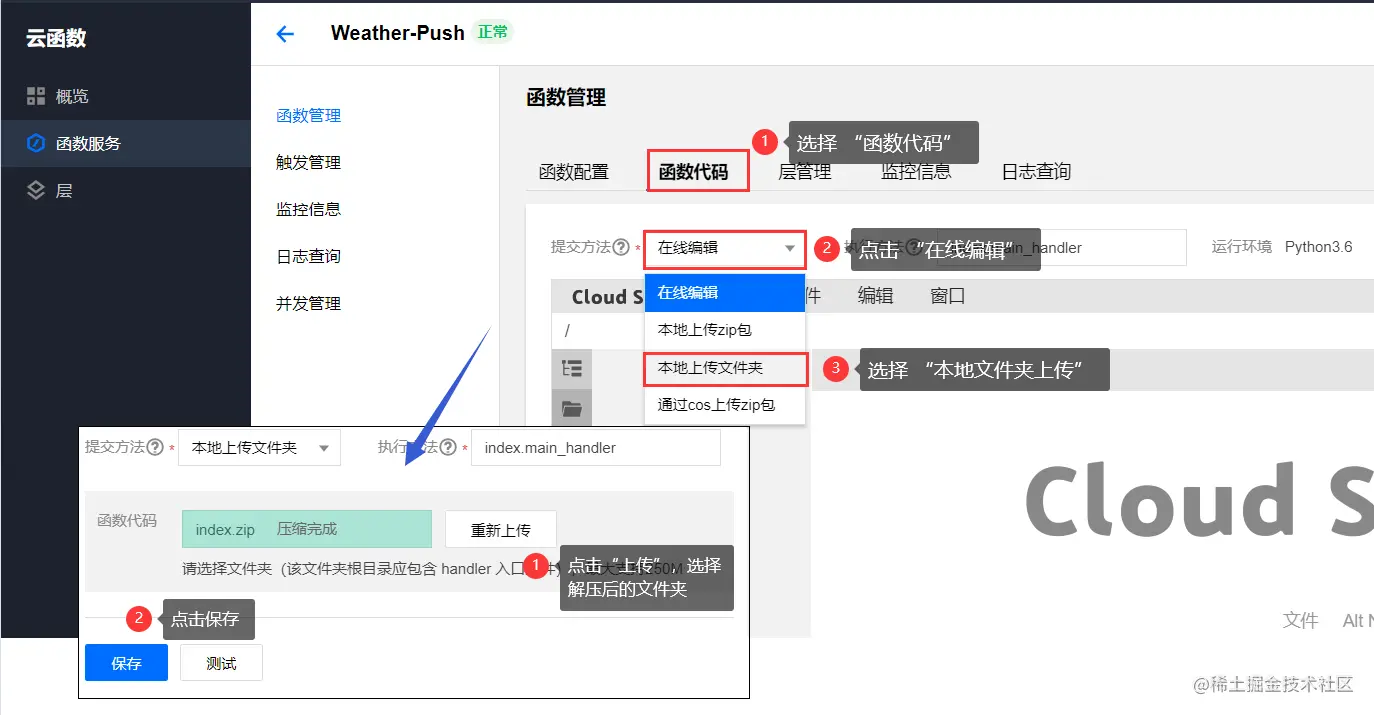 注意:尽管云函数有直接上传zip的选项,但我尝试了几次均上传失败,所以请务必解压后上传。