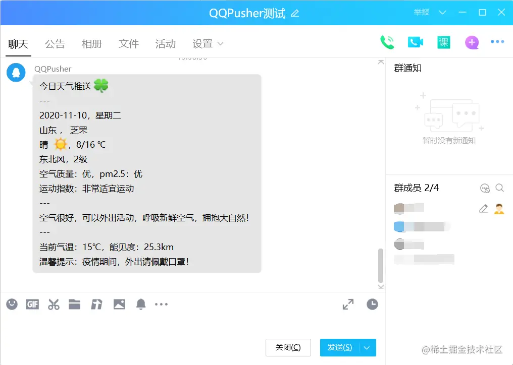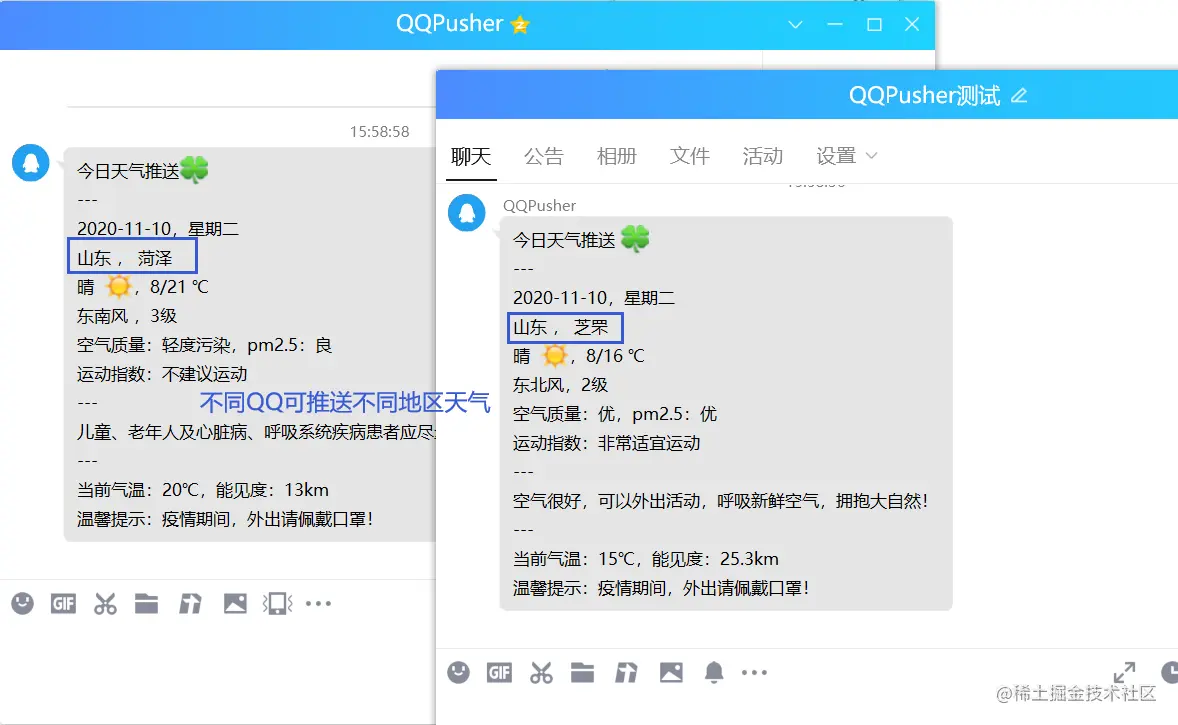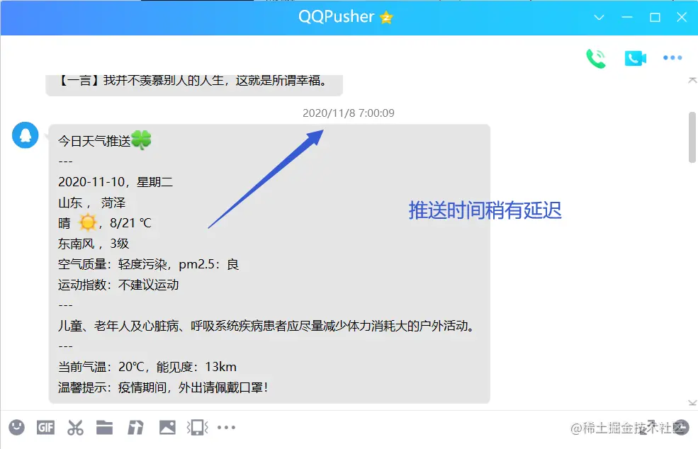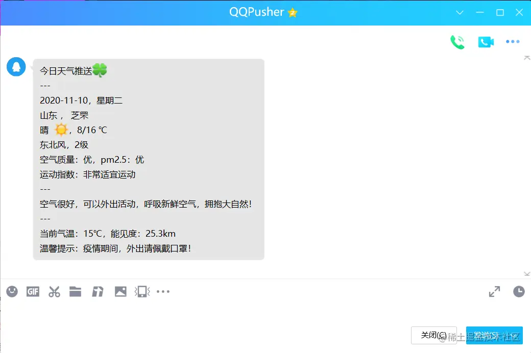 - 推送内容丰富(日期,地区,天气,最高气温,最低气温,当前气温,风向,风力,空气指数,pm2.5指数,运动指数,天气小提示,能见度等内容)