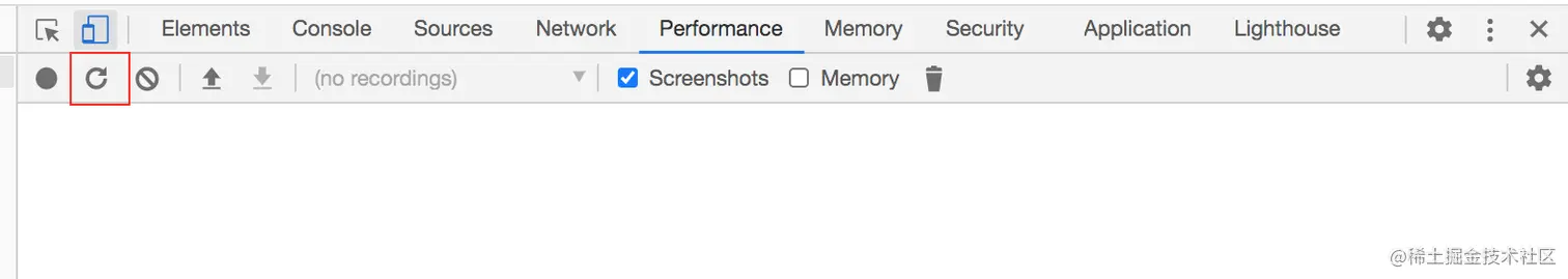 3、点击performance面板左上角的刷新按钮start profiling and reload page,如图