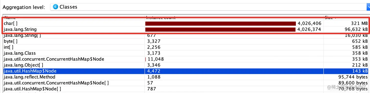 可以看到,使用Jprofiler内存分析工具的结果为:321MB + 96632KB,约等于417MB。之所以使用Jprofiler内存分析工具得出的结果比我们计算的大些,是因为在程序实际运行的过程中,程序内部也会生成一些字符串,这些字符串也会占用内存空间!!