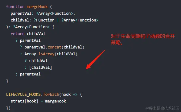 首先介绍上图中 mergeOptions(parent,child) 函数,主要功能就是把两个参数对象合并到一个对象 options 上,最后返回 options。该函数是在初始化过程中调用执行,并且对于 parent/child 不同的 key 有不同的合并策略。