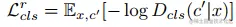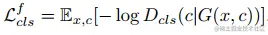 对于一个输入图像x和目标分布标签c,我们的目标是将x转换为输出图像y,y能够被正确分类为目标分布c。为了实现这一目标,我们在D的顶部加入了辅助分类器,并加入分布分类损失函数,使其对生成器和判别器都起到正则化的作用.也就是说,我们将这个式子分解为两部分:一个真实图像的分布分类损失用于约束判别器D,一个假的图像的分布分类损失用于约束生成器G。