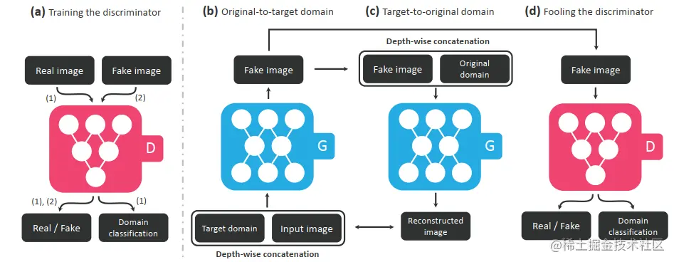 上图中的两个生成器 G 是同一个生成器,整个StarGAN中只使用了一个生成器和一个判别器。