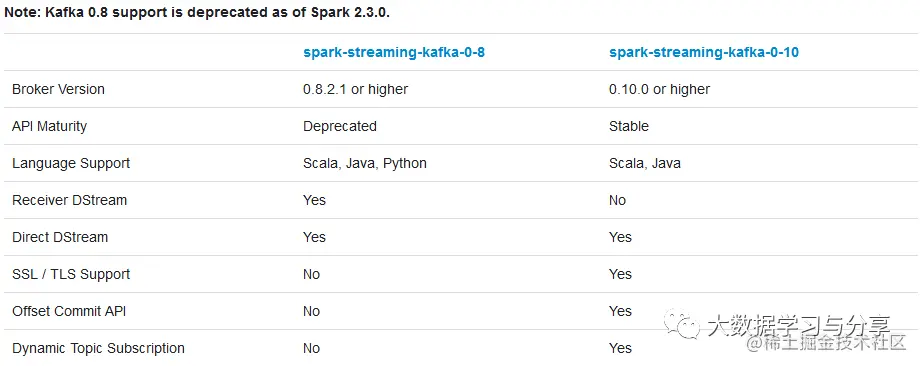 针对不同的spark、kafka版本,集成处理数据的方式分为两种:Receiver based Approach和Direct Approach,不同集成版本处理方式的支持,可参考下图: