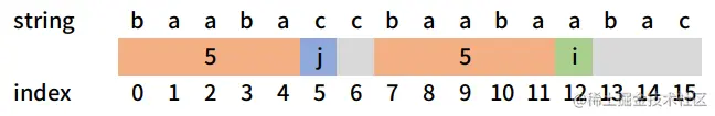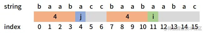 可以看到上图中下标j = 4与下标i = 11处字符相等,我们可以由此推断出字符串string[:i+1] = 'baabaccbaaba'的最长公共前后缀的长度值为5。