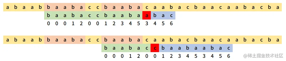 我们在一个长串中寻找string = 'baabaccbaabaabac',下图中绿色表示匹配成功,红色表示匹配失败,蓝色表示尚未匹配。