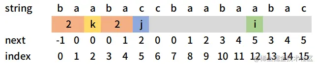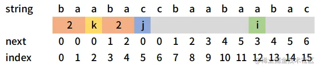 通过上图不难看出next[j-1]即string[:j] = 'baaba'的最长公共前后缀的长度为2,且下标k = 2与下标i = 12处字符相等,我们可以由此推断出字符串string[:i+1] = 'baabaccbaaba'的最长公共前后缀的长度值为3。