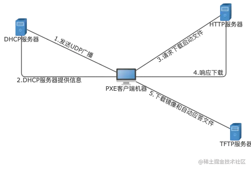 PXE 客户端从PXE网卡启动,通过PXE BootROM(自启动芯片)以UDP(简单用户数据报协议)发送一个广播请求,向本网络中的DHCP服务器索取IP。