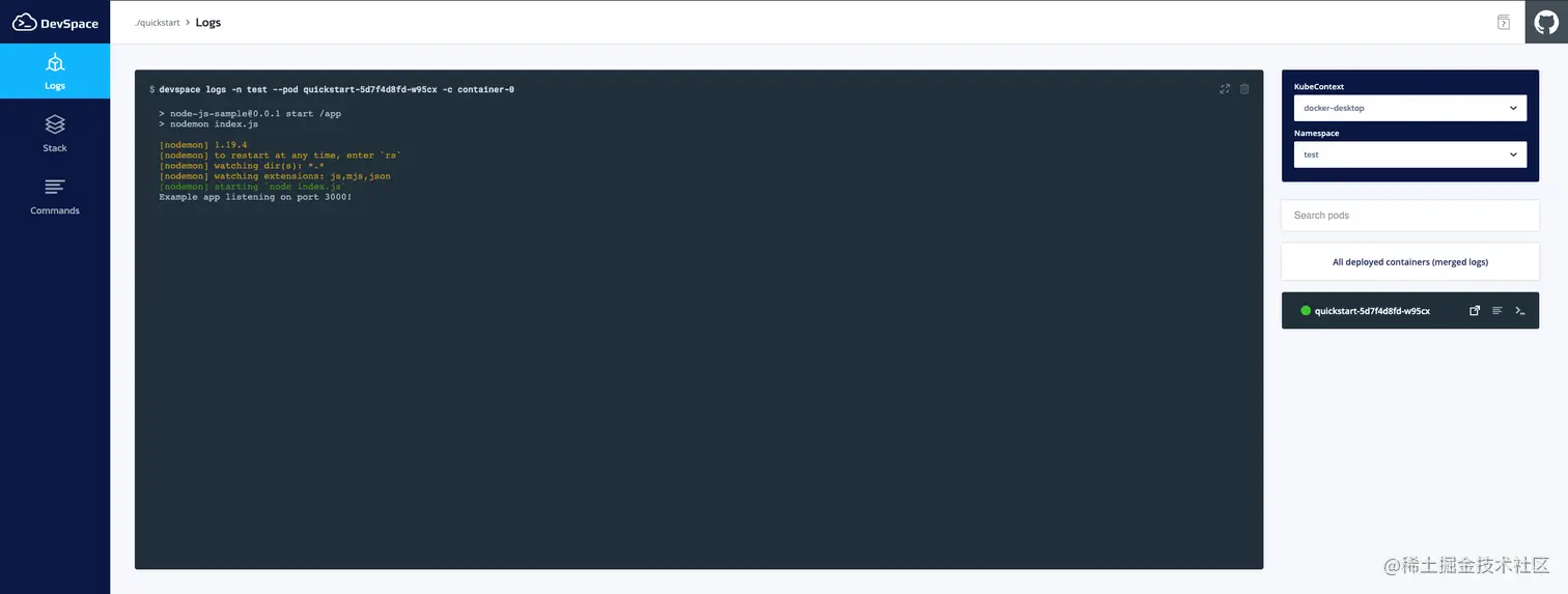 然后DevSpace会启动一个本地UI,你可以访问和检查创建的pod。这简化了与Kubernetes的交互,特别是对于不熟悉kubectl的用户。