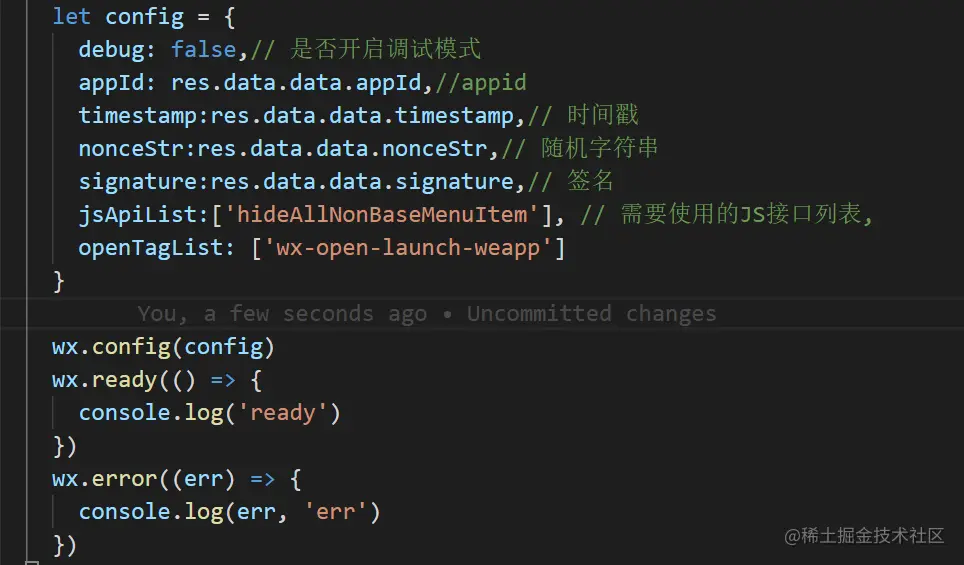在你的项目中引入wx的js res.wx.qq.com/open/js/jwe… 此处第一个坑来了,在安卓和ios上不同的是。如果你的页面启用了https,那么你在必须引入res.wx.qq.com/open/js/jwe… 否则会在ios9.0以上系统中成功使用jssdk。 接下来你需要后端配合你配置一些wx.config需要的参数,直接上代码