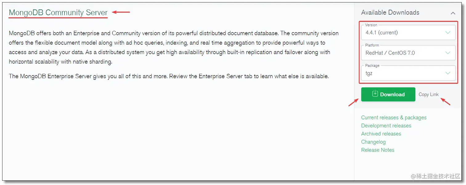 在页面中选择 MongoDB Community Server 社区版,根据自己的系统选择对应的版本,我自己使用的是 CentOS 版本。而 MongoDB 只有 RedHat 版本,下载使用即可。