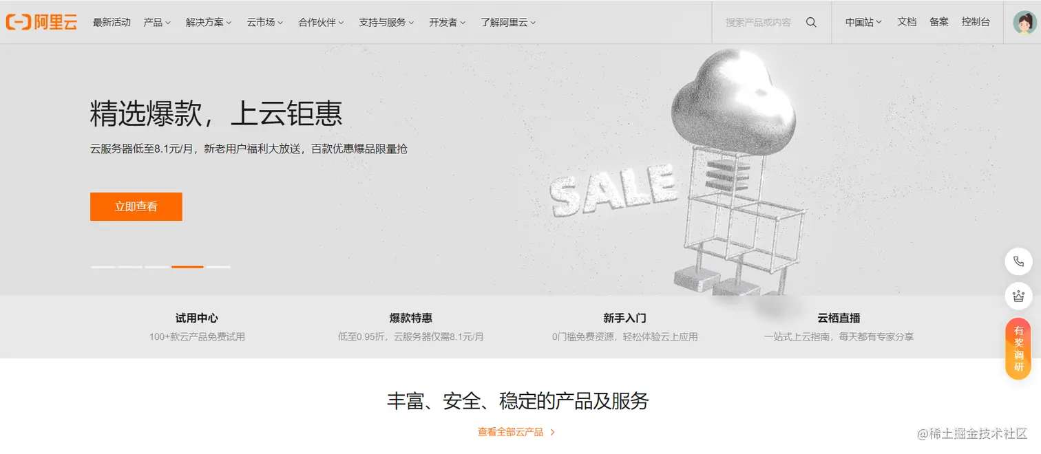 其次,垂直导航是网页中最常见的设计元素,几乎绝大多数的网站都会有看到垂直导航,而旧版的阿里云和新版的最大的也是最先看到的就是取消了原有的旧垂直导航栏,想必这是设计对重复和对比原则的充分理解和应用。毕竟我看隔壁家的腾讯云还是有个垂直栏放着,