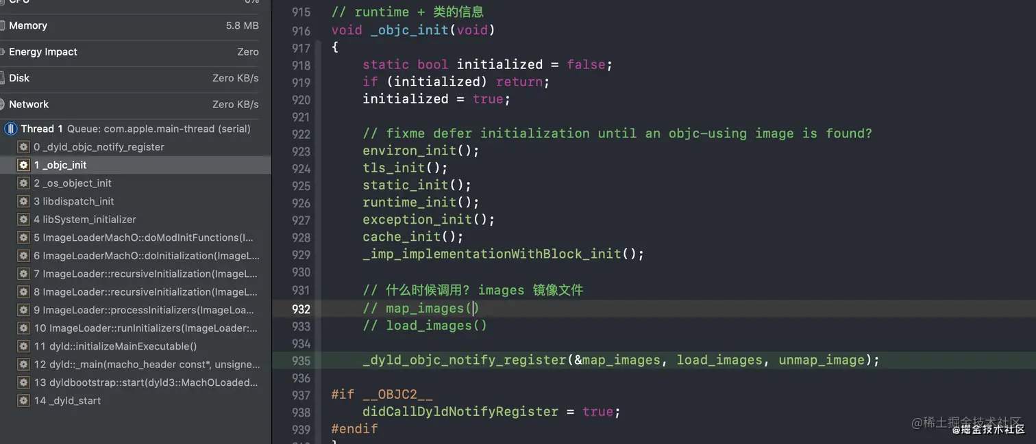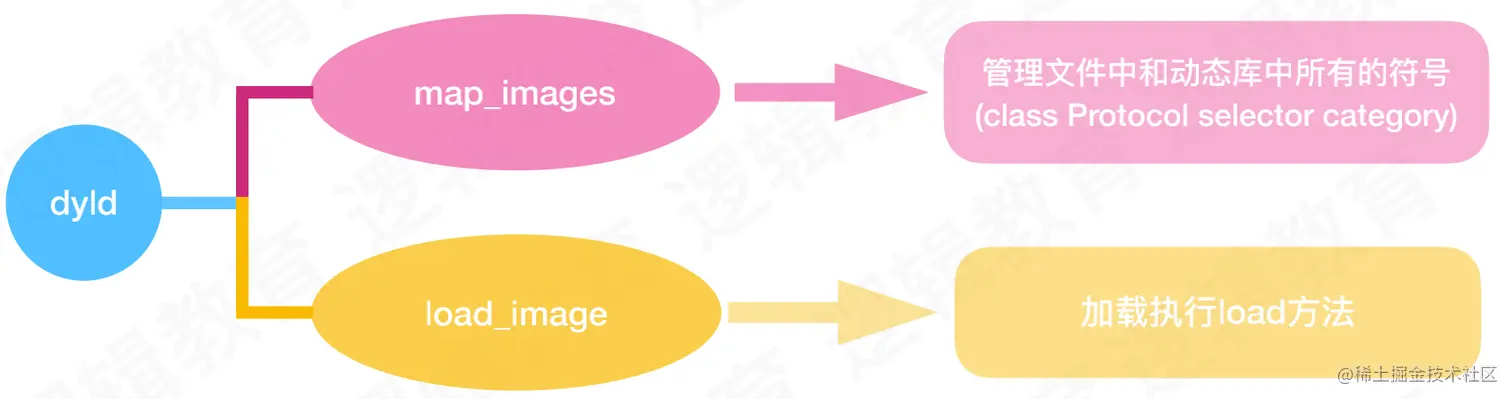 environ_init(): 读取影响运⾏时的环境变量。如果需要,还可以打印环境变量帮助。tls_init()关于线程key的绑定 - ⽐如每线程数据的析构函数static_init()运⾏C ++静态构造函数。在dyld调⽤我们的静态构造函数之前,libc会调⽤_objc_init(),因此我们必须⾃⼰做runtime_init(): runtime运⾏时环境初始化,⾥⾯主要是:unattachedCategories,allocatedClasses的初始化,后⾯会分析exception_init ()初始化libobjc的异常处理系统cache_init()缓存条件初始化_imp_implementationWithBlock_init:启动回调机制。通常这不会做什么,因为所有的初始化都 是惰性的,但是对于某些进程,我们会迫不及待地加载trampolines dylib_dyld_objc_notify_register: 我们向dyld注册了三个回调,分别是:map_iamges、load_iamges、unmap_images。